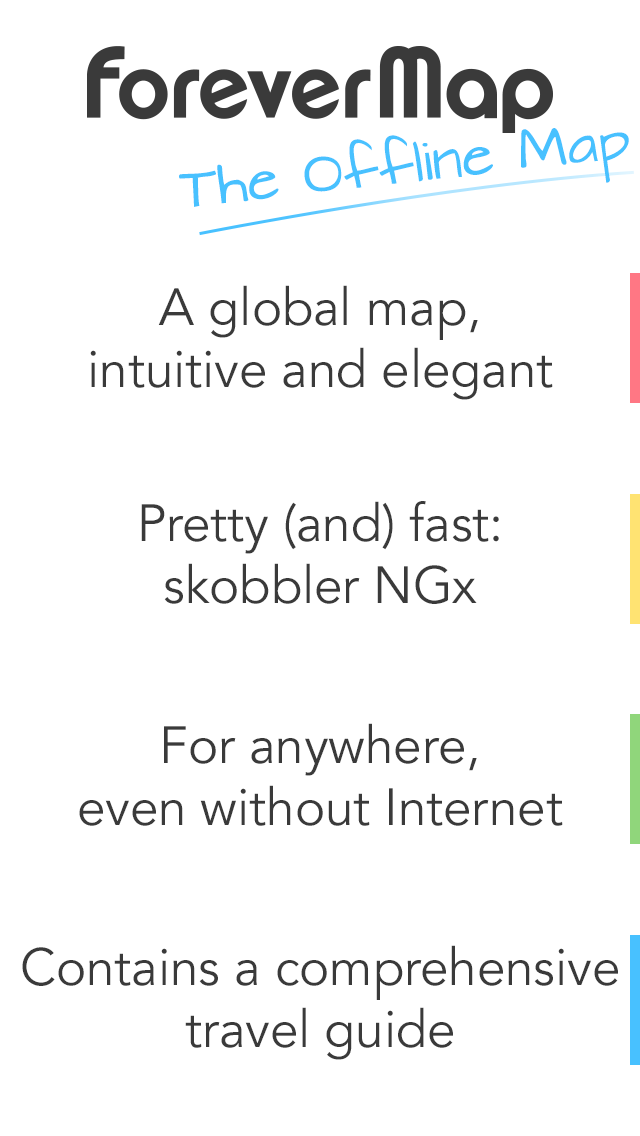 ForeverMap 2 is itself a startling innovation in modern mapping. Market-leading alternatives such as Google Maps offer very little offline functionality and cannot perform searching or routing without an internet connection, and while CityMaps2Go does offer city downloads these are not seamlessly integrated into one map. ForeverMap2 trumps all of them by remaining a truly hybrid solution, ensuring that all key features are also available offline. And with the all new wiki travel guide featuring around 90,000 English-language pages written by registered wiki travelers from around the world, ForeverMap 2 has truly become the ultimate app for travelers. The wiki travel guide adopts the same open-source premise as OpenStreetMap, ensuring that travel data is regularly updated, accurate and informed by the people that know the area best. What’s more, downloadable content is far less data-heavy than alternatives and can be added and removed as the user sees fit. All features are available both online and offline as standard, with no in-app purchases and no additional fees.